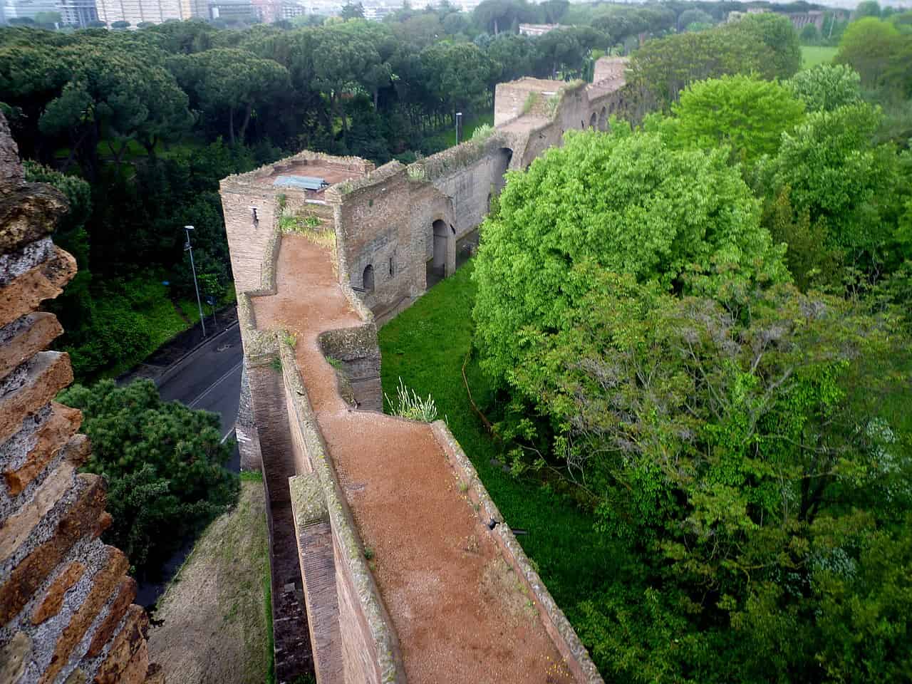 Roma venne circondata da una cerchia muraria imponente, lunga circa 19 chilometri (oggi ne sono rimasti circa 12,5), alta circa 6 metri e spessa 3,5. Ogni 30 metri le Mura Aureliane erano interrotte da torri quadrate, alla cui sommità c’era un ampio locale che ospitava le baliste, macchine da guerra che lanciavano proiettili di pietra. In tutto le torri erano 383 e lungo la cinta muraria si aprivano anche 14 porte principali e innumerevoli altre secondarie.
