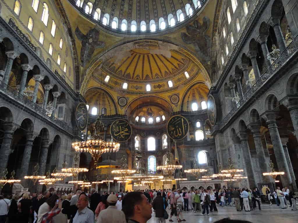 In seguito alla conquista turca del 1453, la Basilica di Santa Sofia divenne la più importante moschea della città, come si vede bene dalle immagini che mostrano all’esterno i minareti (le alte torri dalle quali i muezzin chiamano i fedeli musulmani alla preghiera) e all’interno gli scudi con i versetti del Corano.